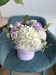 Фіолетовий бокс:біла гортензія,евкаліпт,міні ведмедик,еустома,кущова троянда блоссом баблз.